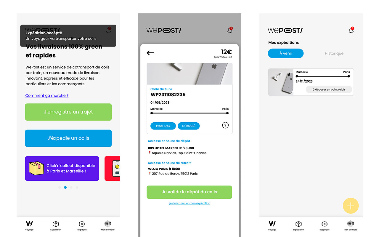 Janvier 2021. Sophie Brette et Bruno Hameurt lancent WePost à Marseille — une idée simple et juste : utiliser les trajets TGV et TER déjà programmés pour transporter des colis de ville à ville. Zéro émission supplémentaire. Le voyageur est rémunéré. L'expéditeur reçoit son colis en quelques heures.